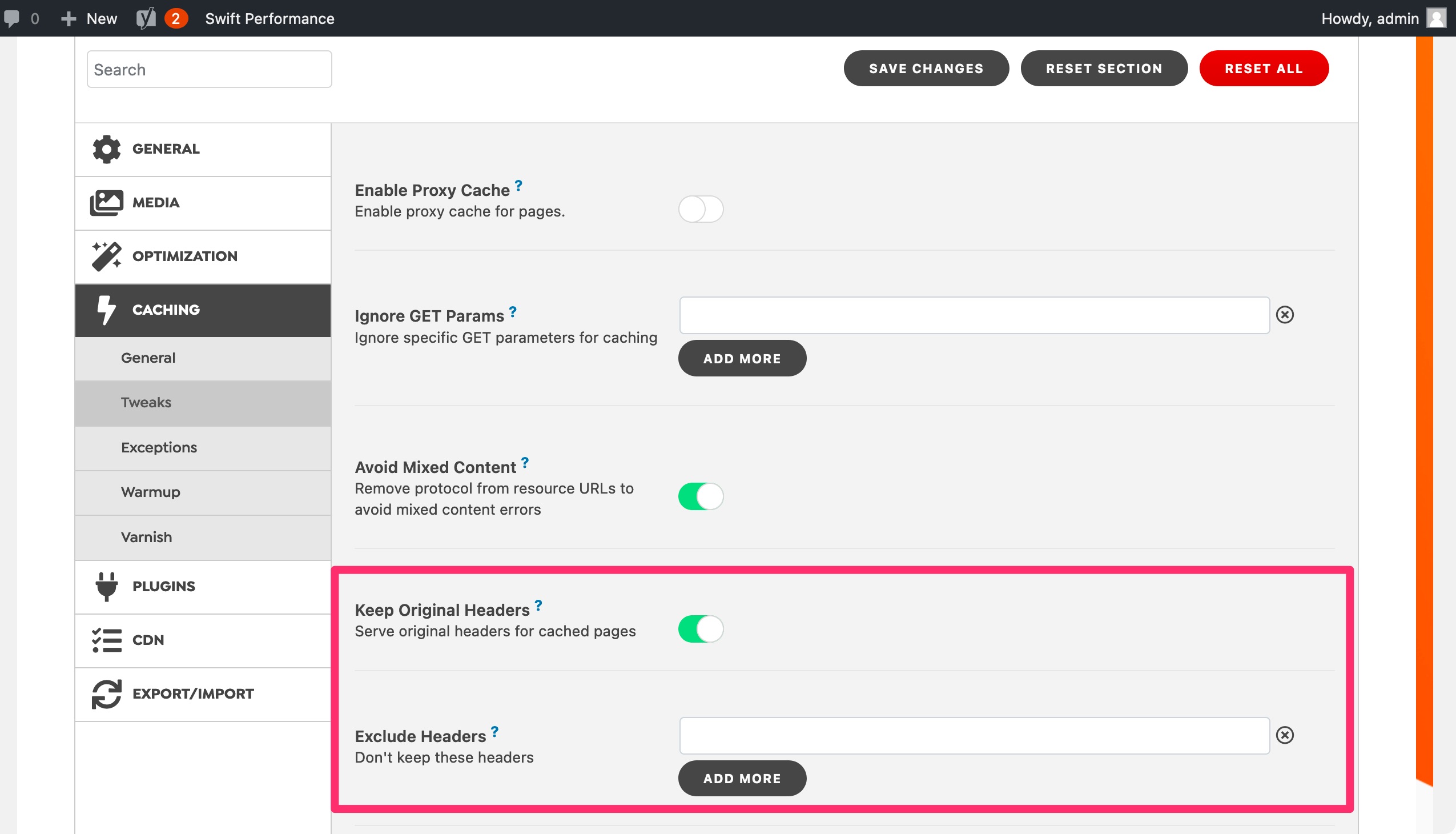 If you enable this option, it will keep all headers, except Content-Encoding, and Set-Cookie headers. Of course you can add more exceptions with Exclude Headers option.
