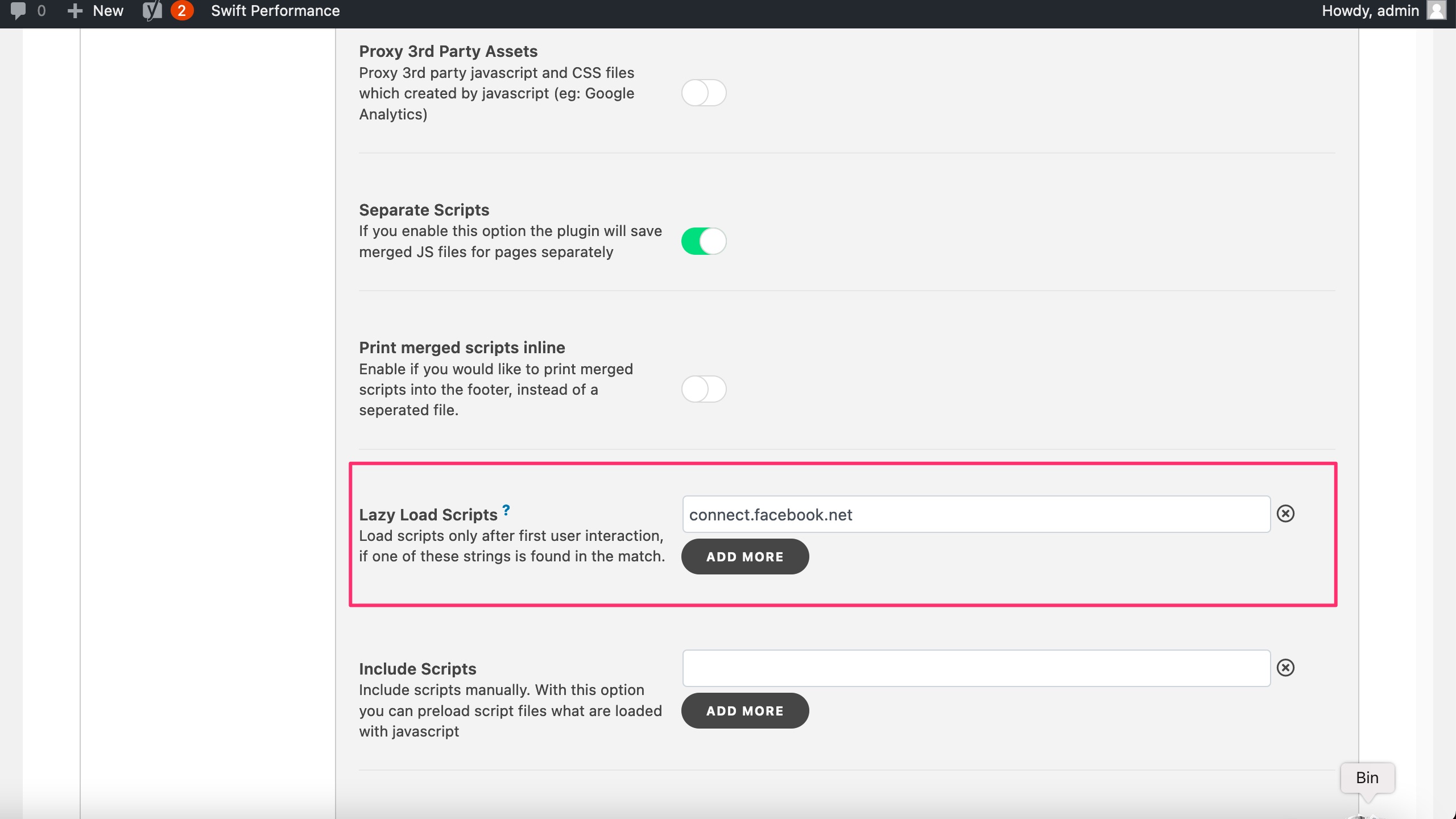 Swift Performance will load and run lazyloaded scripts after mouse move, touchstart, or scroll event.